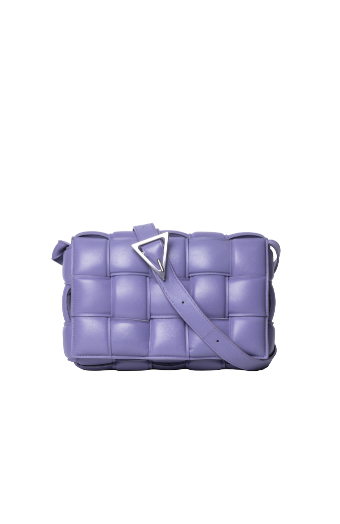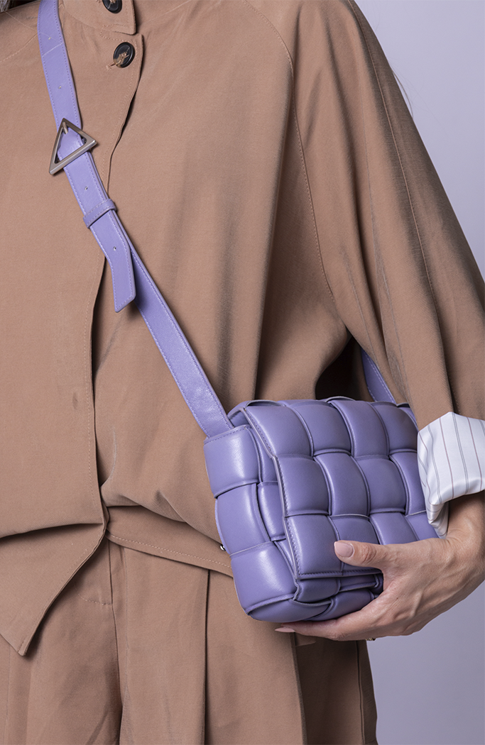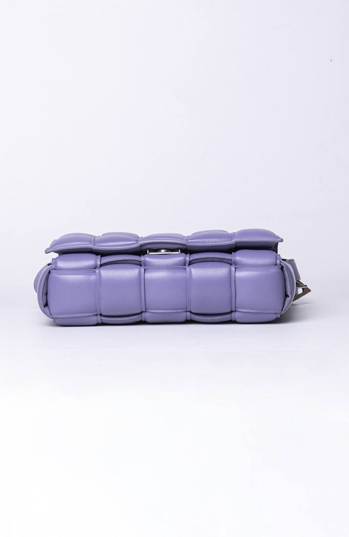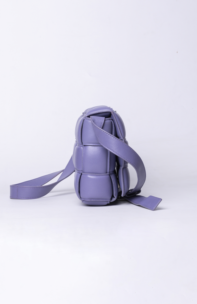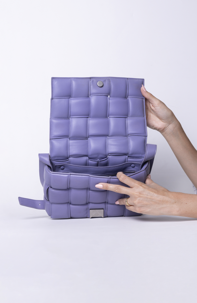 - Confeccionada em couro lambskin roxo com acabamento intreccio