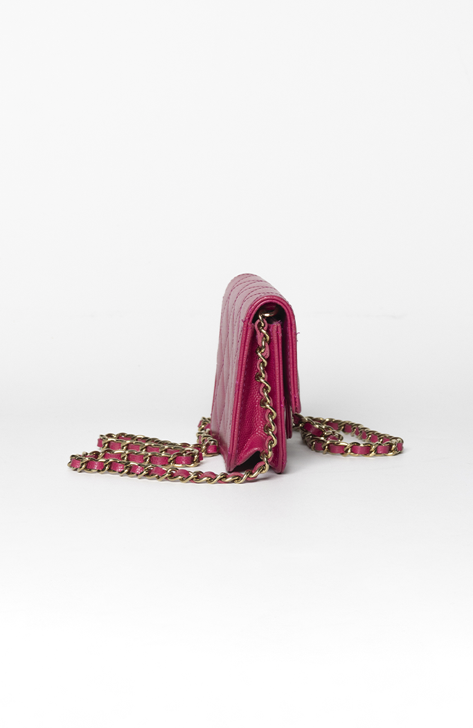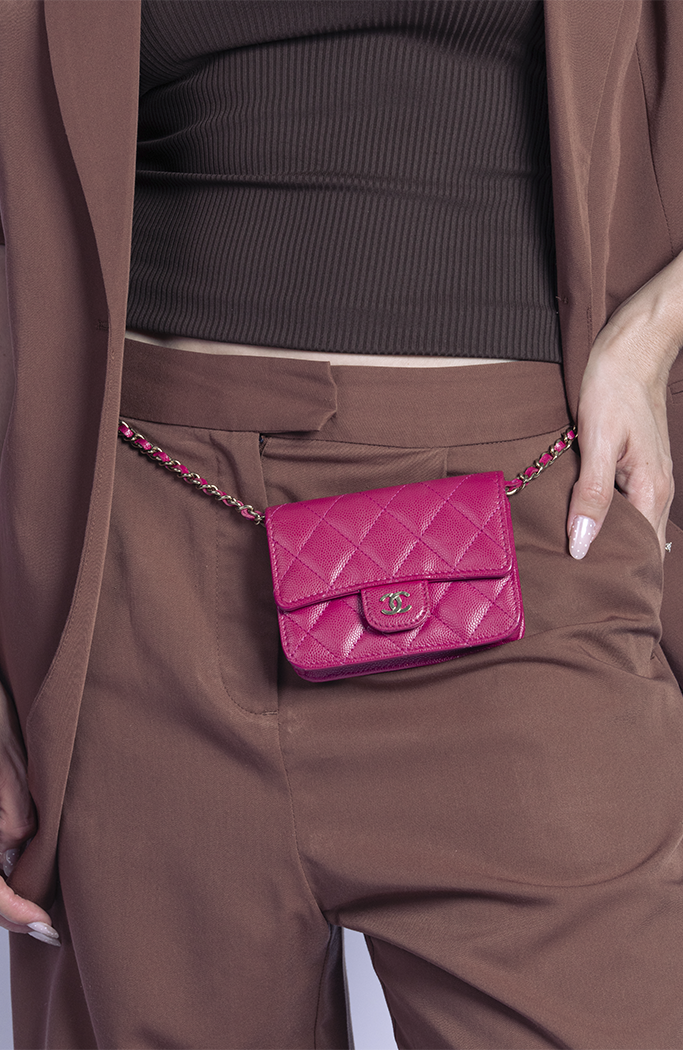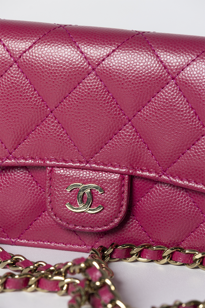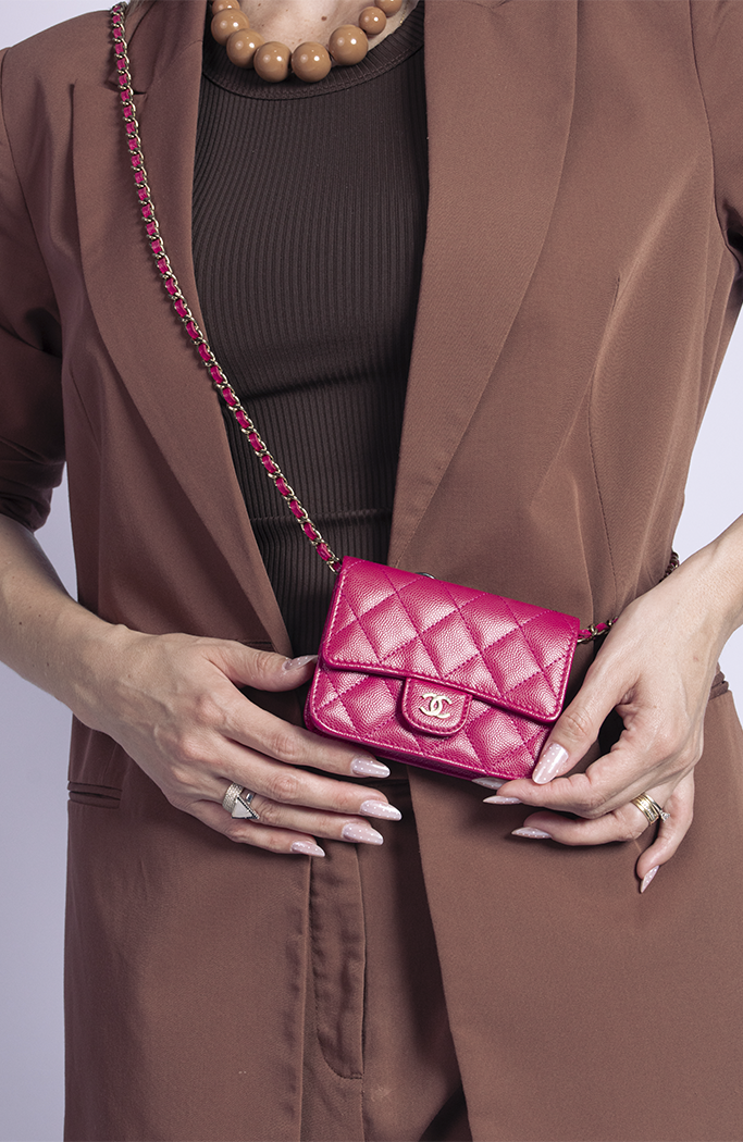- Confeccionada em couro calfskin rosa com acabamento Caviar e matelassê