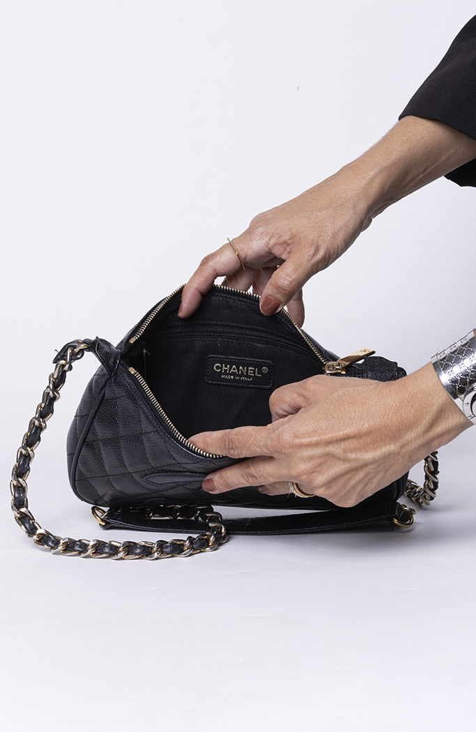 - Confeccioanada em couro calfskin com acabamentos matelassê e caviar