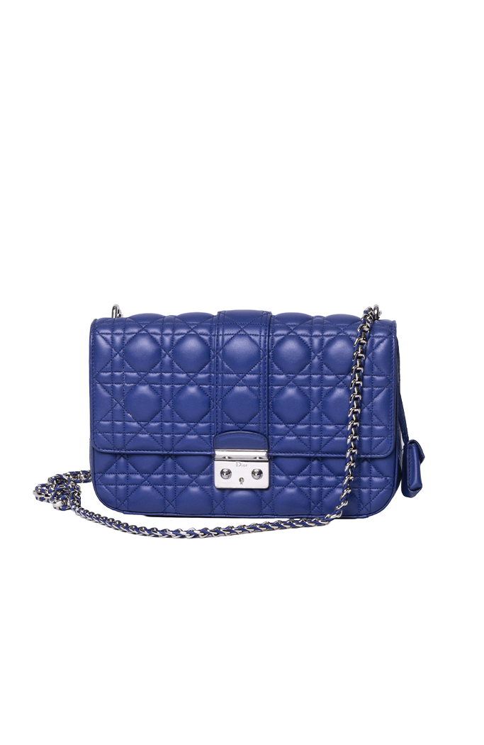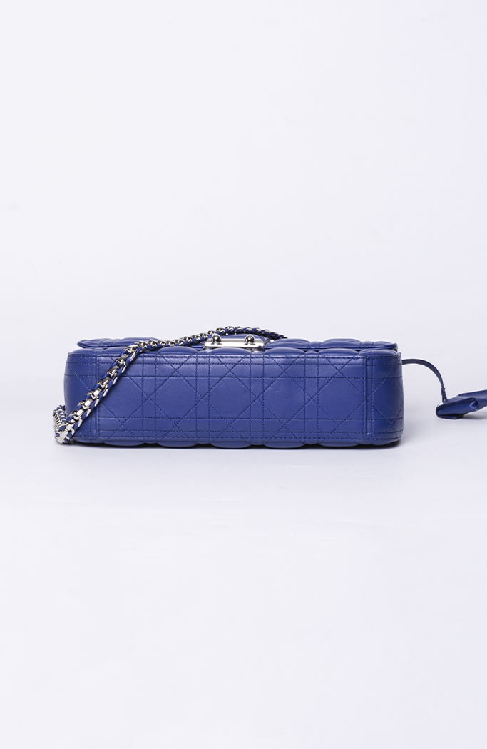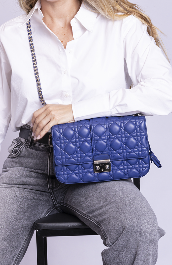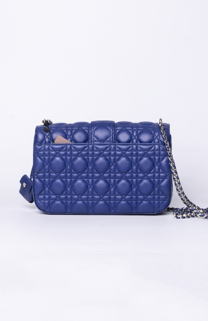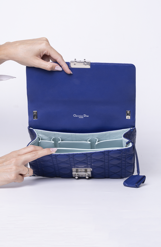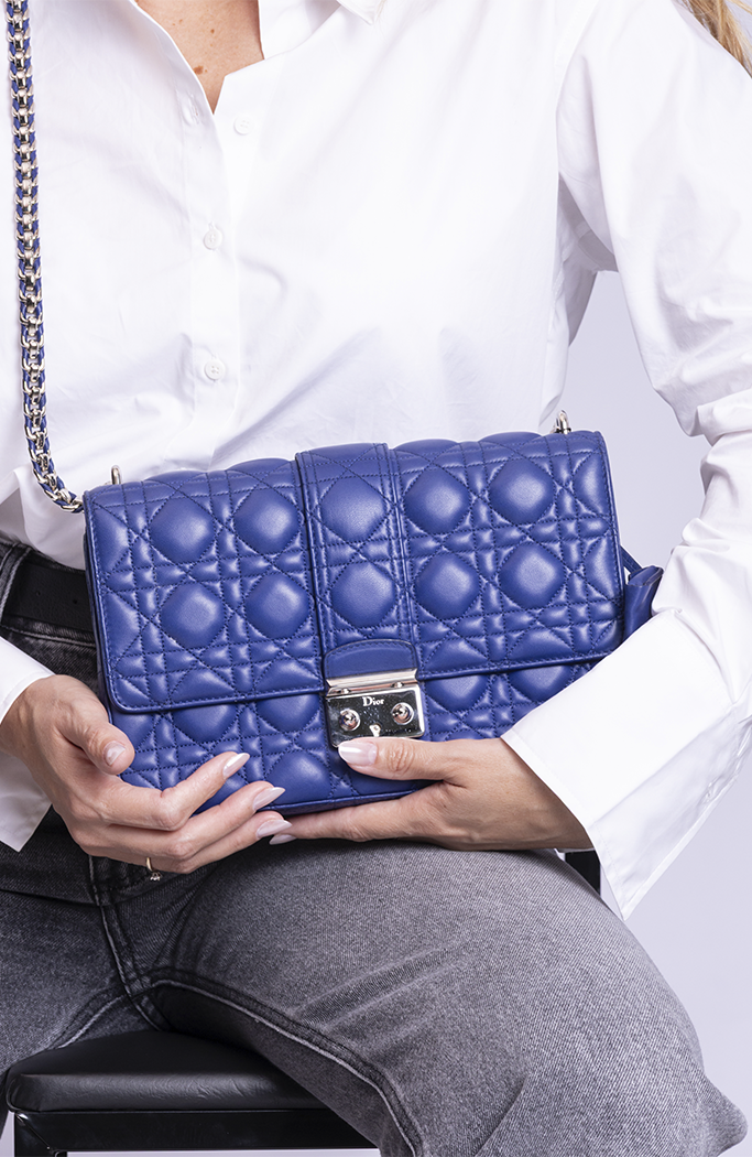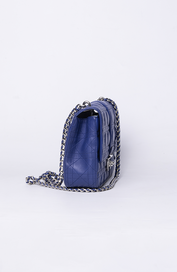 - Confeccionada em couro matelassê na cor azul escuro