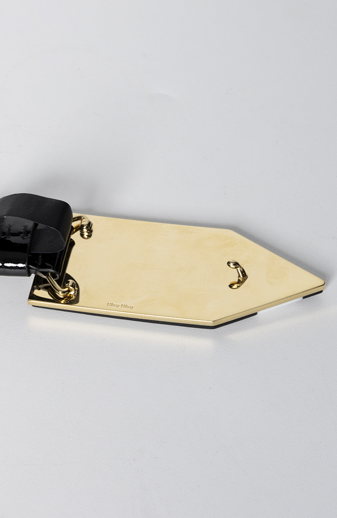 - Confeccionado em couro envernizado na cor porta