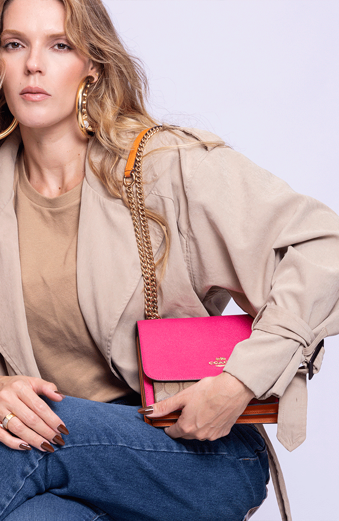 - Alça longa de ombro confeccionada em corrente e couro