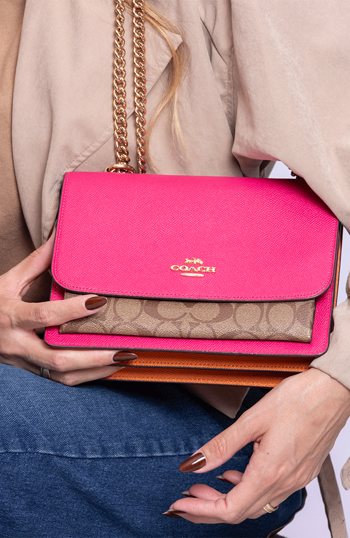 - Confeccionada em couro rosa, laranja e canvas marrom