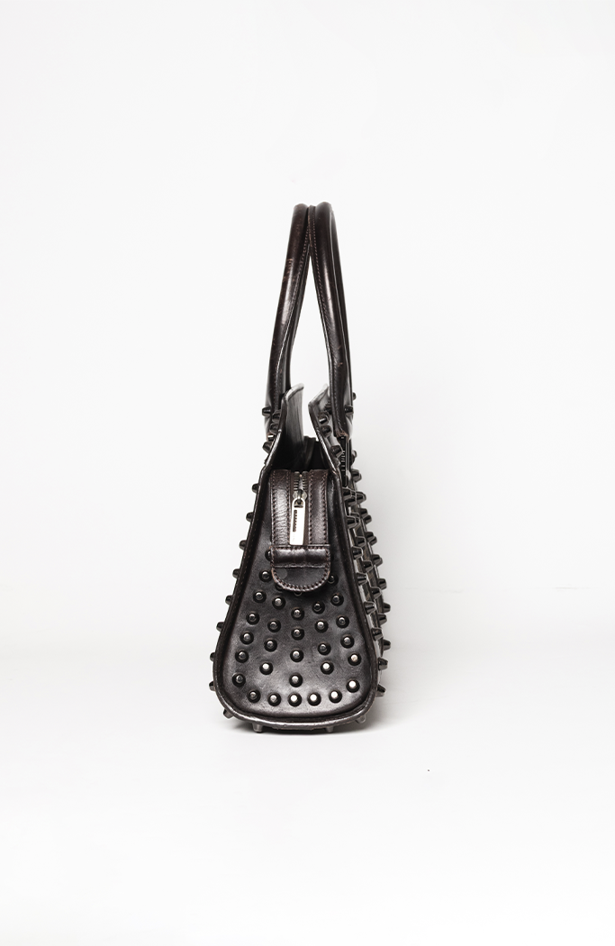 - Confeccionada em couro calfskin marrom e canvas zucca bege