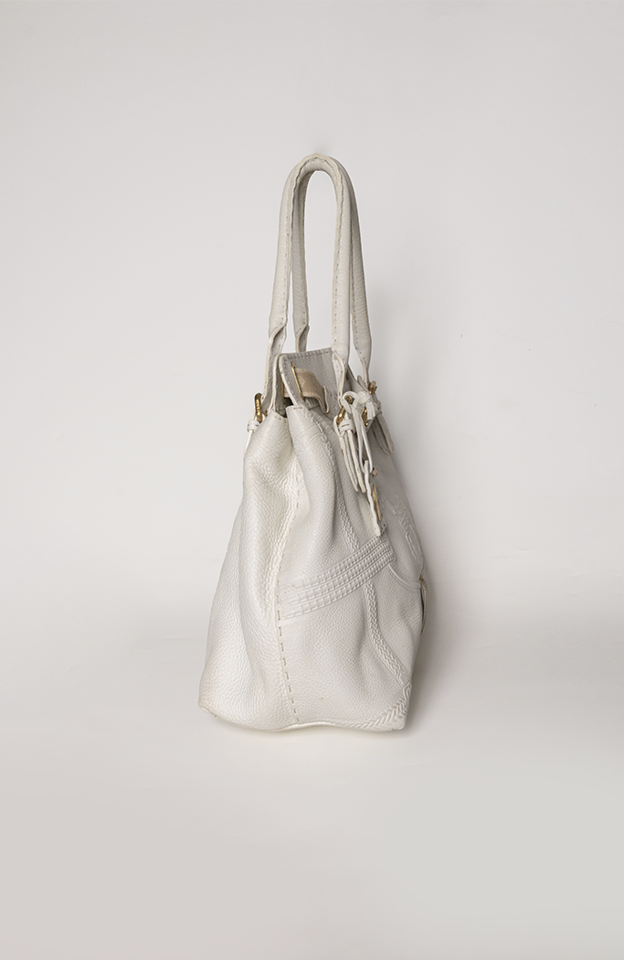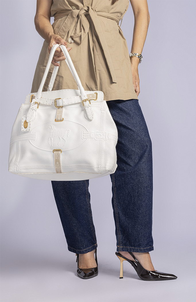 - Confeccionada em couro na cor branca
