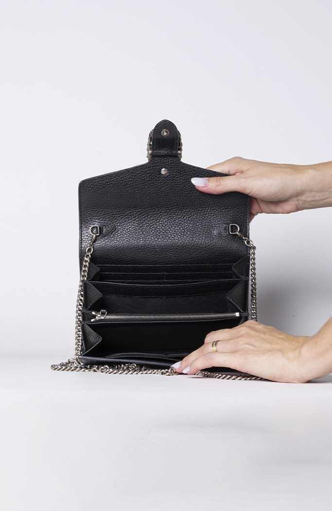 - Compartimento triplo com dois bolsos internos abertos e um bolso fechado por cursor