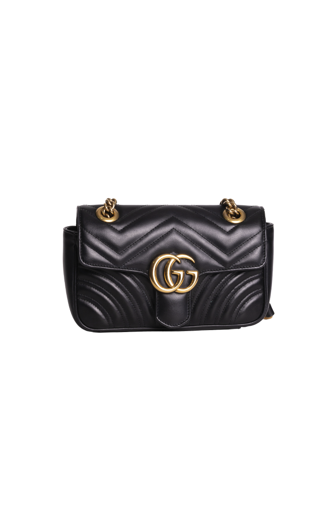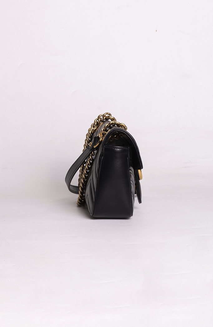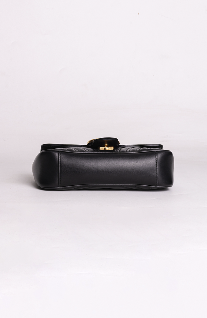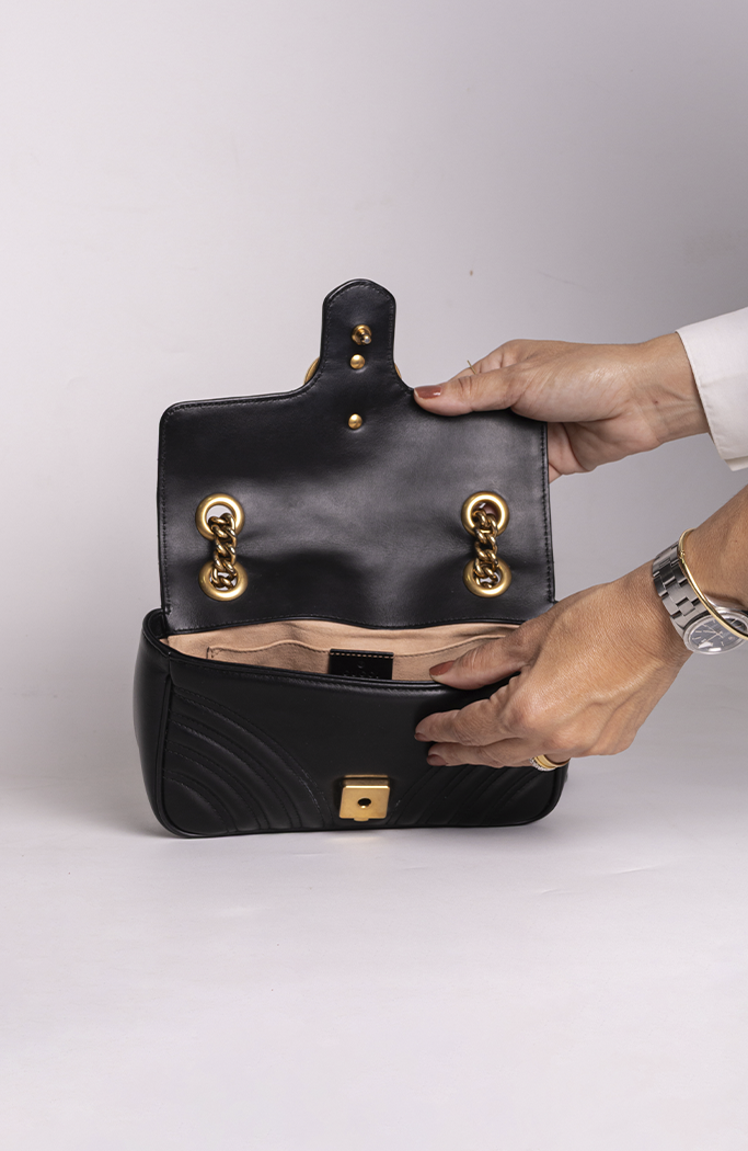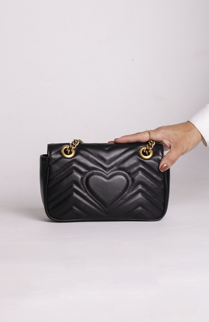 - Confeccionada em couro calfskin preto com acabamento matelassê