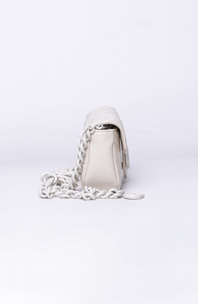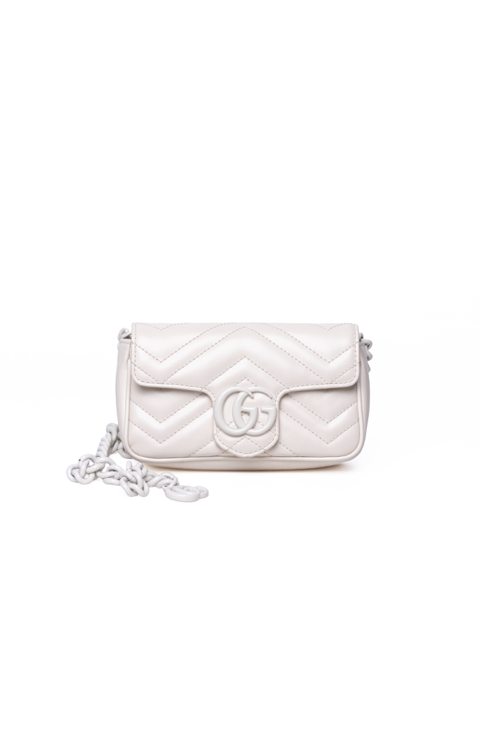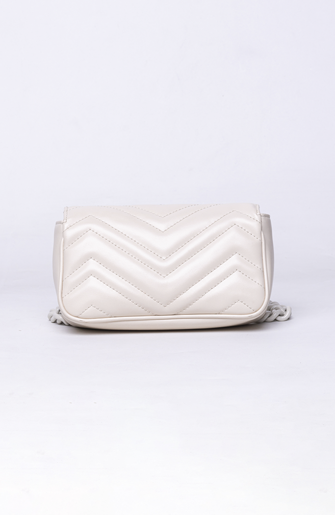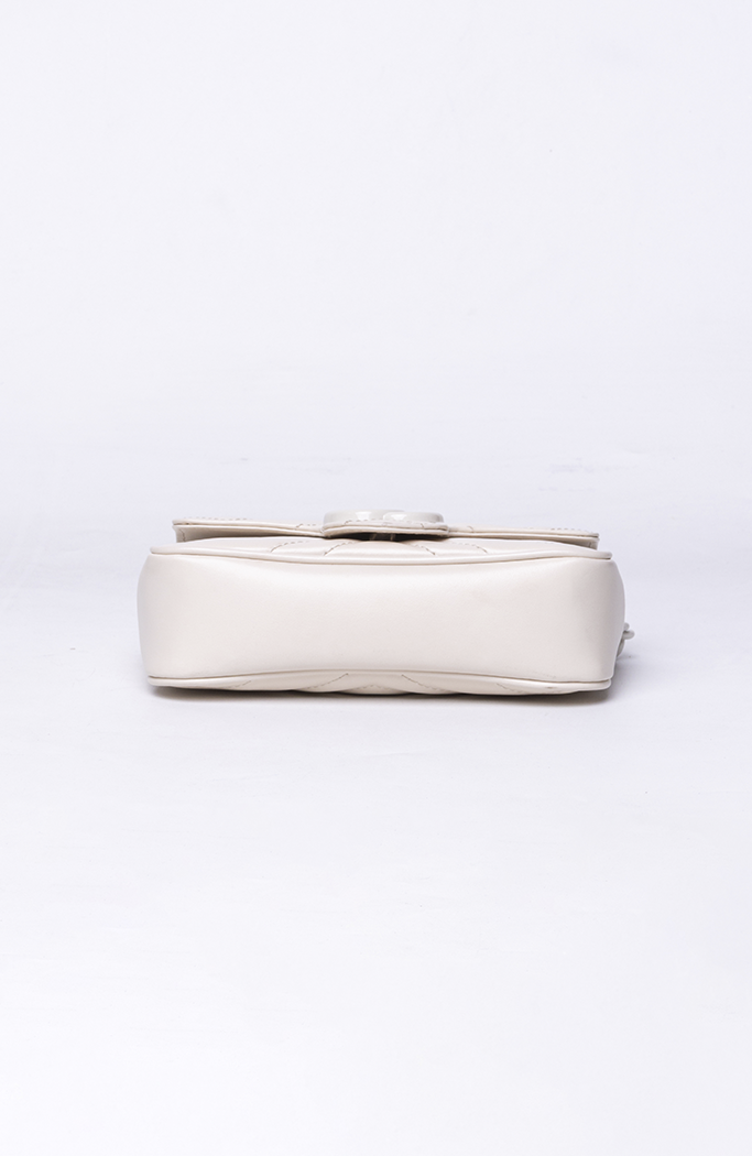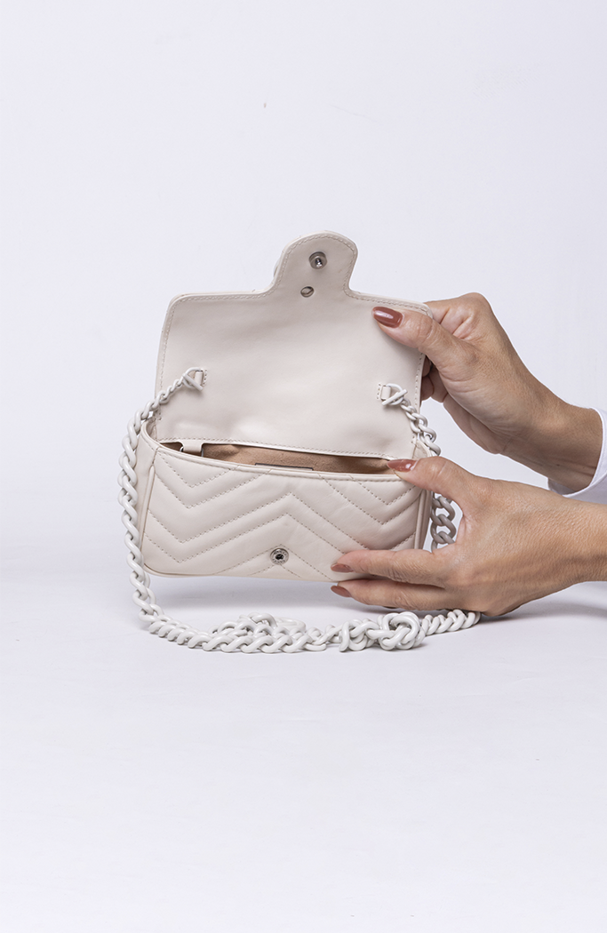 - Confeccionada em couro calfskin off white com acabamento matelassê marmont