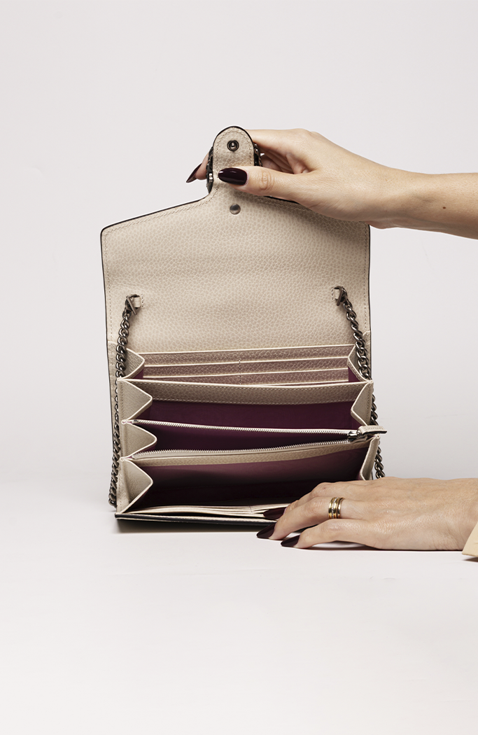 - Compartimento triplo com dois bolsos internos abertos e um bolso fechado por cursor