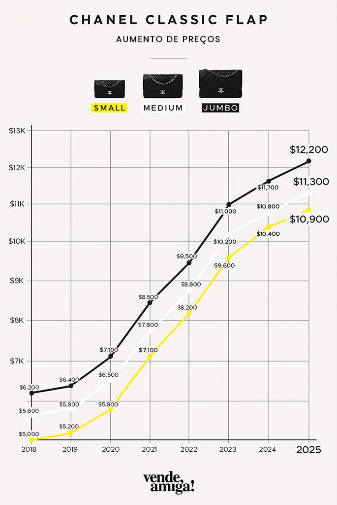 Para entender o impacto, basta olhar um exemplo real: a Classic Jumbo Flap, que custava cerca de US$ 6.400 em 2019, hoje é vendida por US$ 12.200 — um aumento impressionante em apenas seis anos.