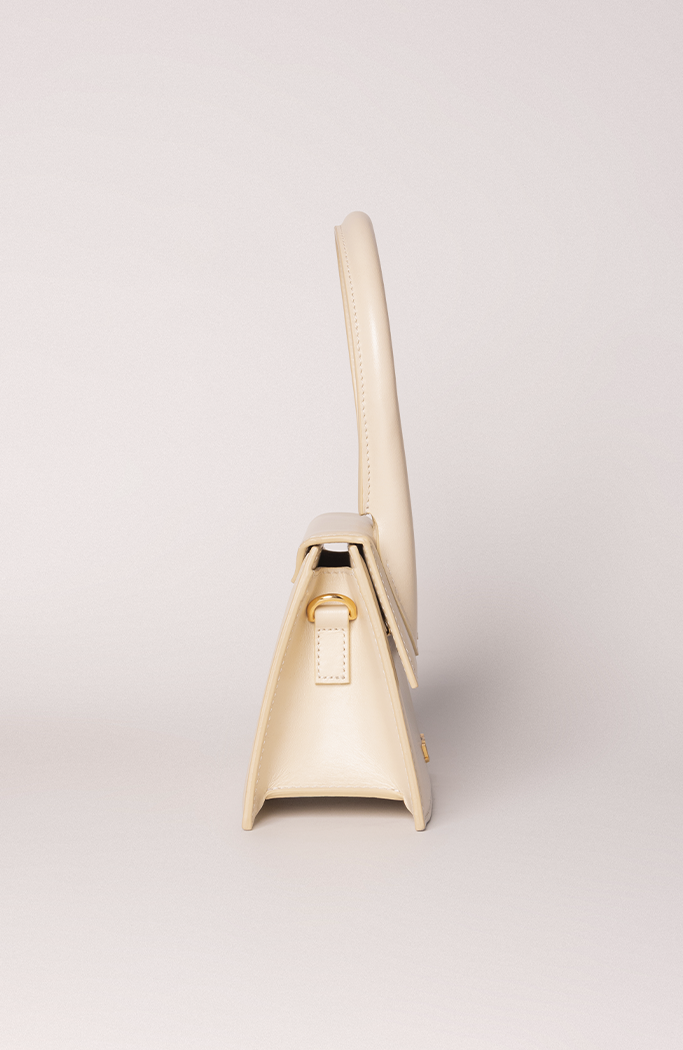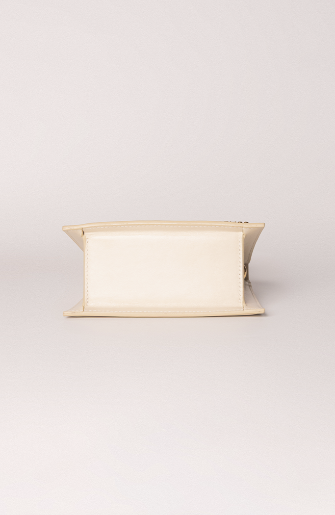 - Confeccionada em couro na cor creme