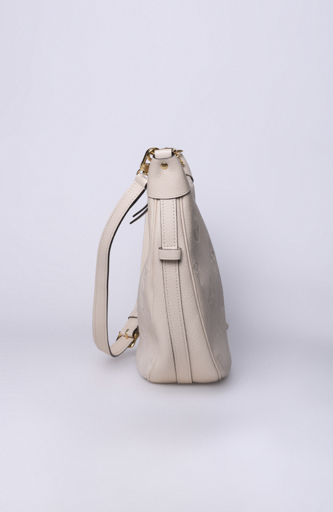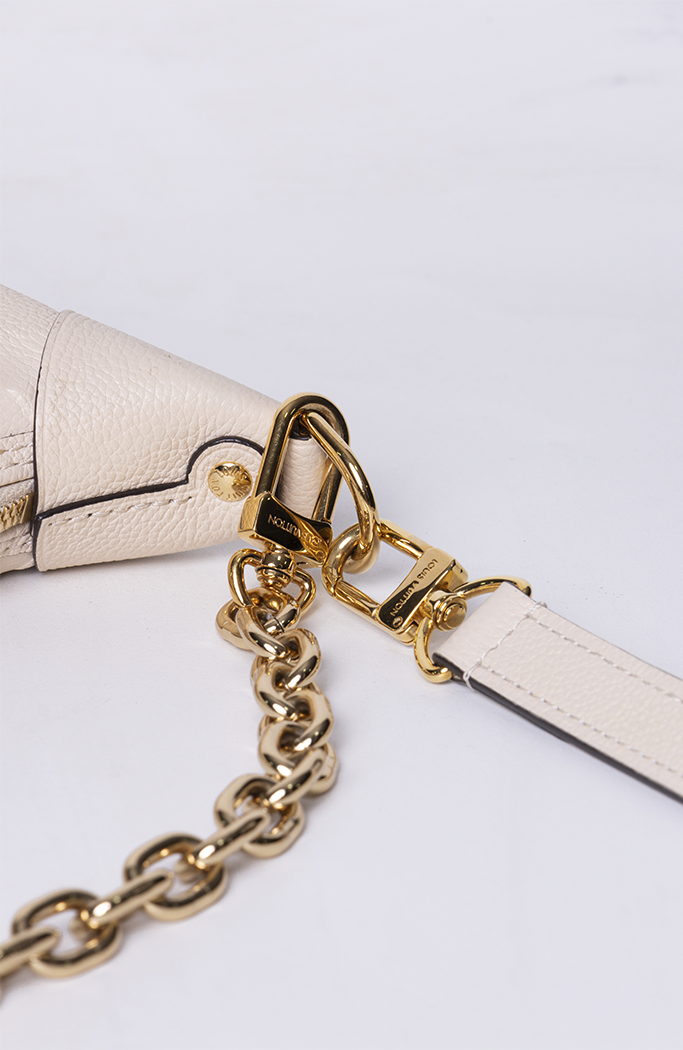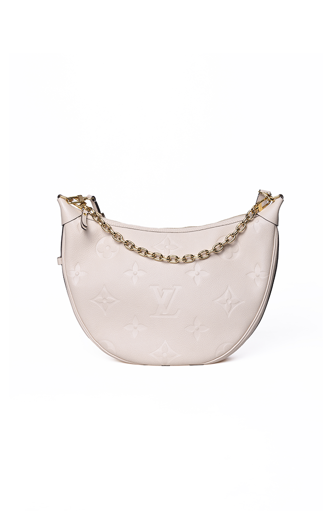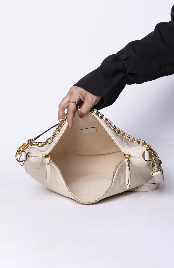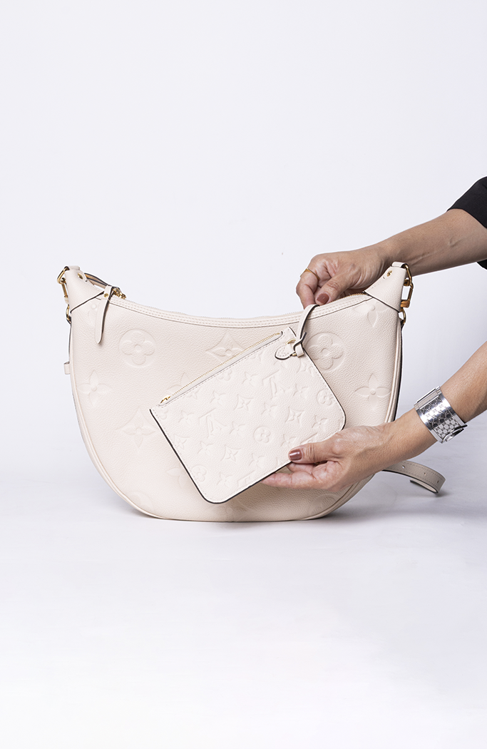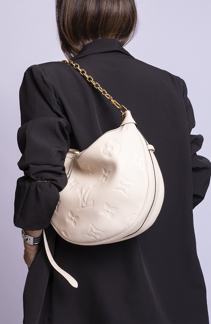 - Confeccionada em couro granulado com relevo monogram empreinte