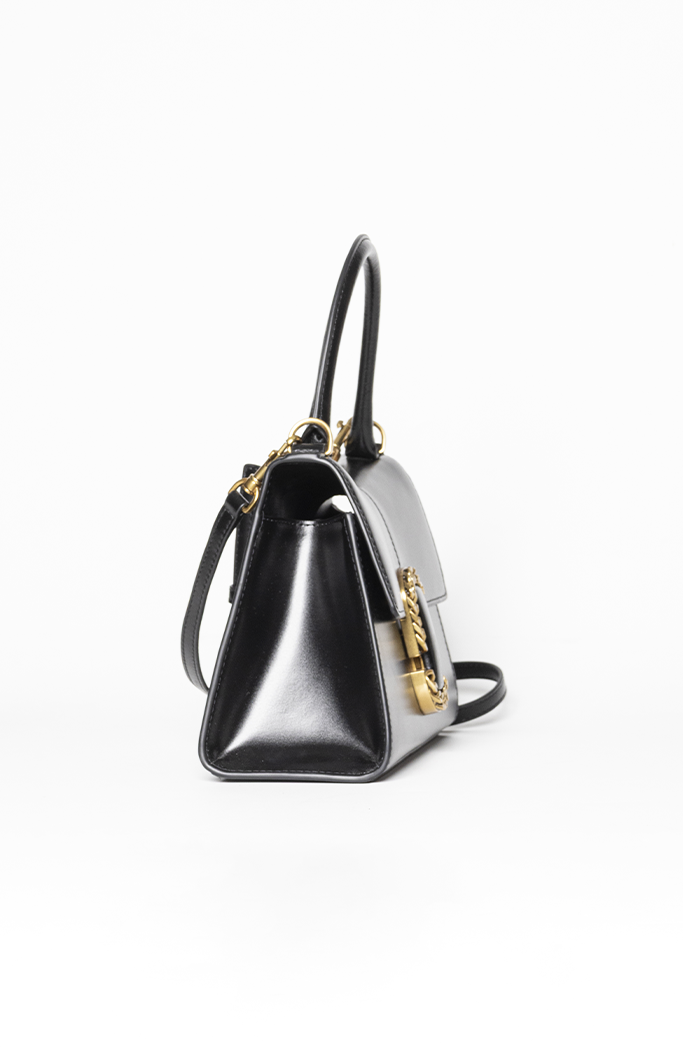- Confeccionada em couro liso na cor preta