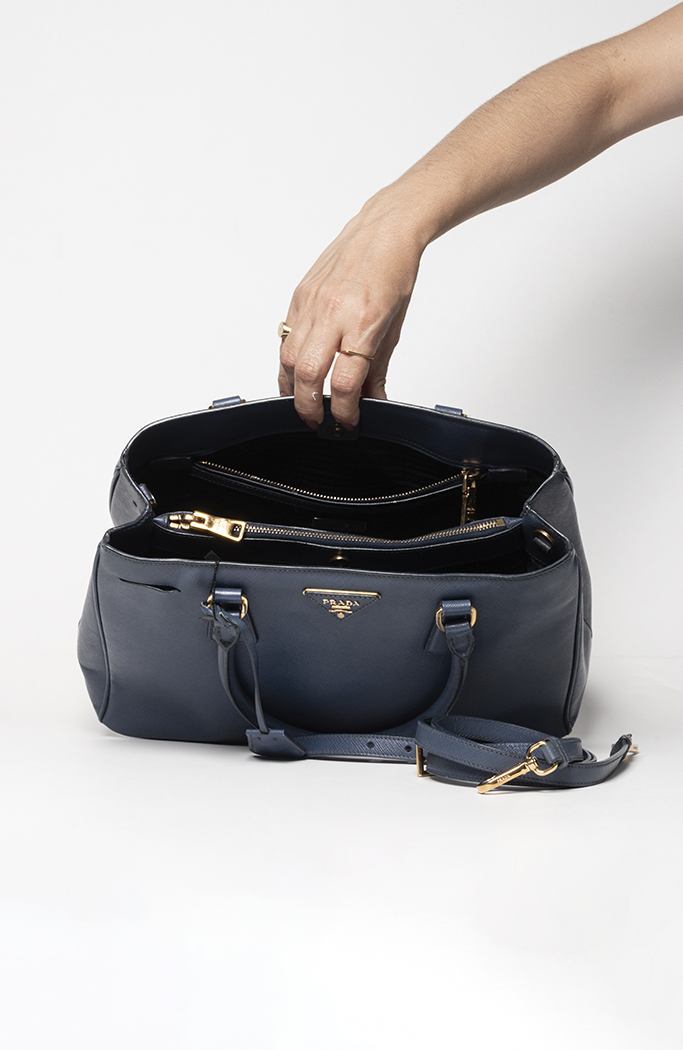 - Compartimento triplo, sendo o central aberto e os demais fechados por zípe, um bolso interno fechado por zíper