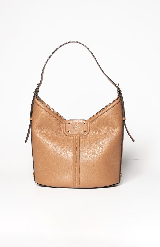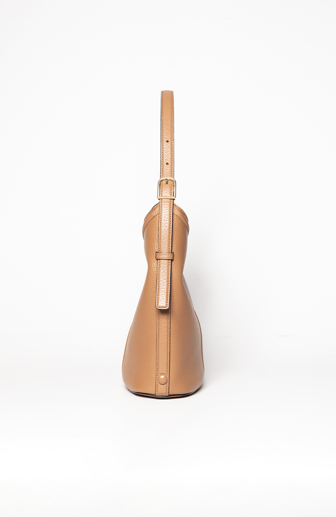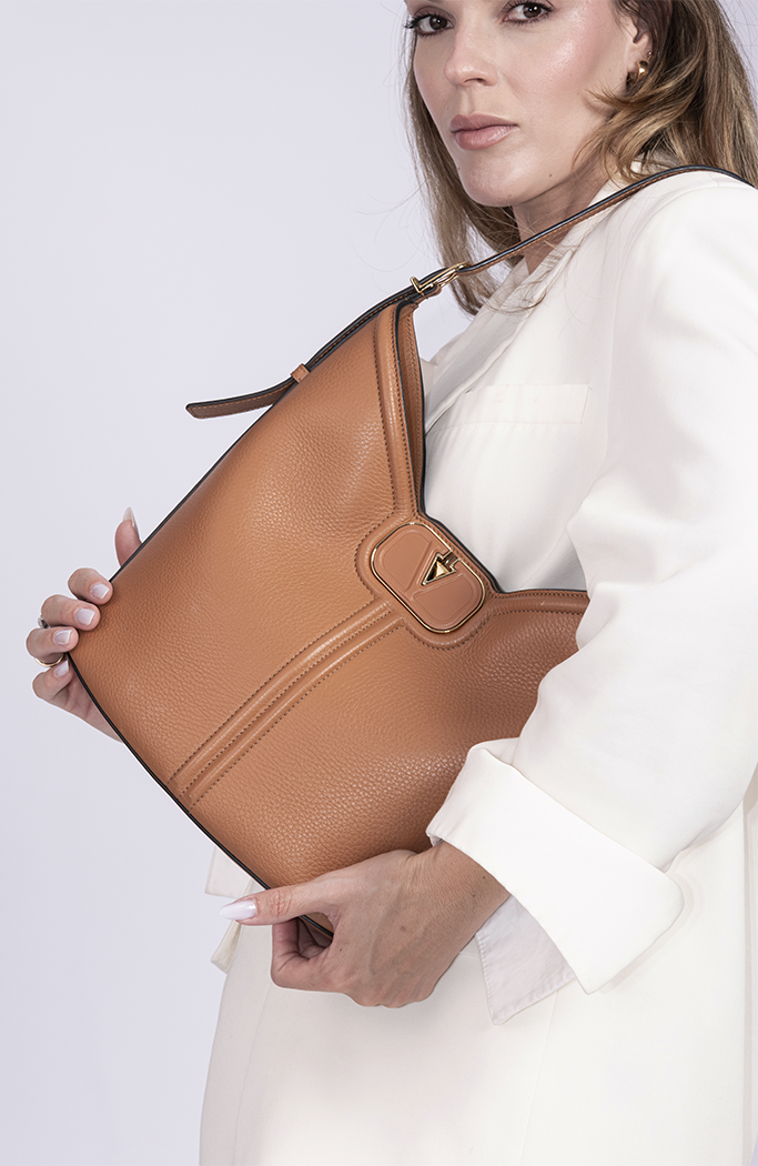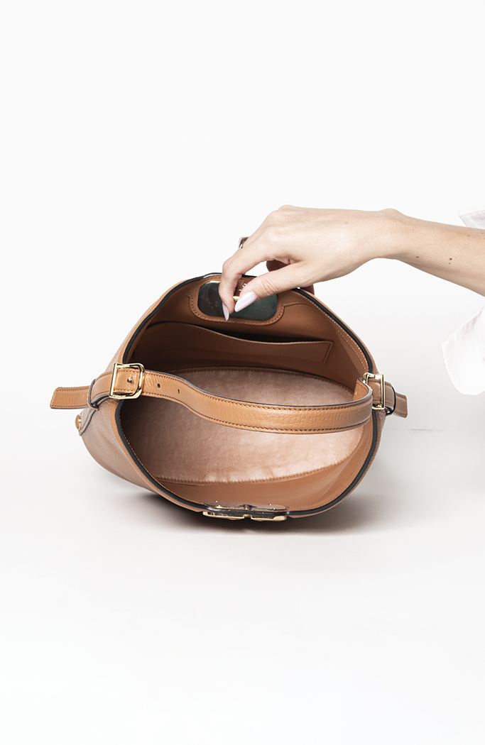 - Confeccionada em couro na cor marrom camelo